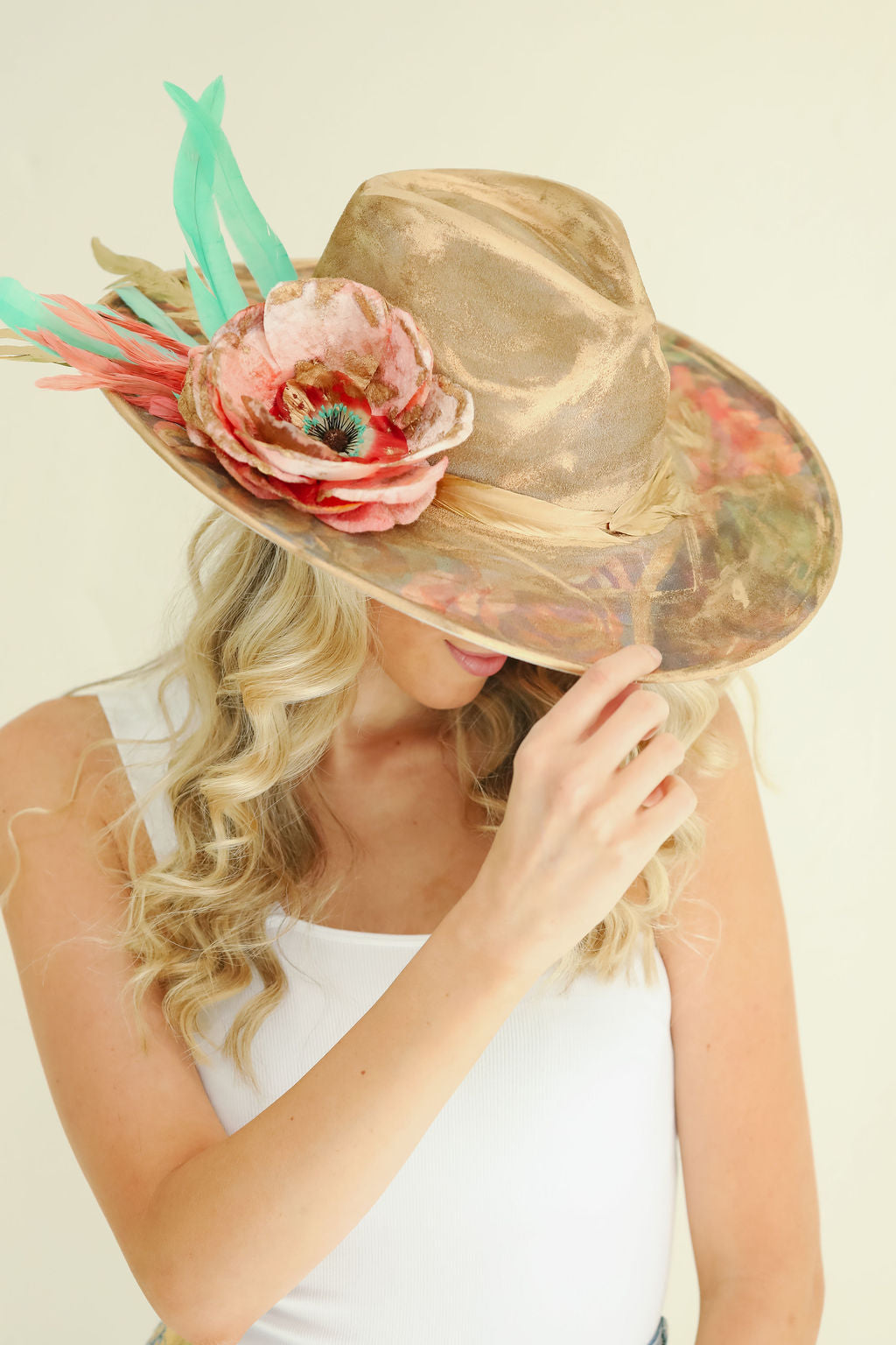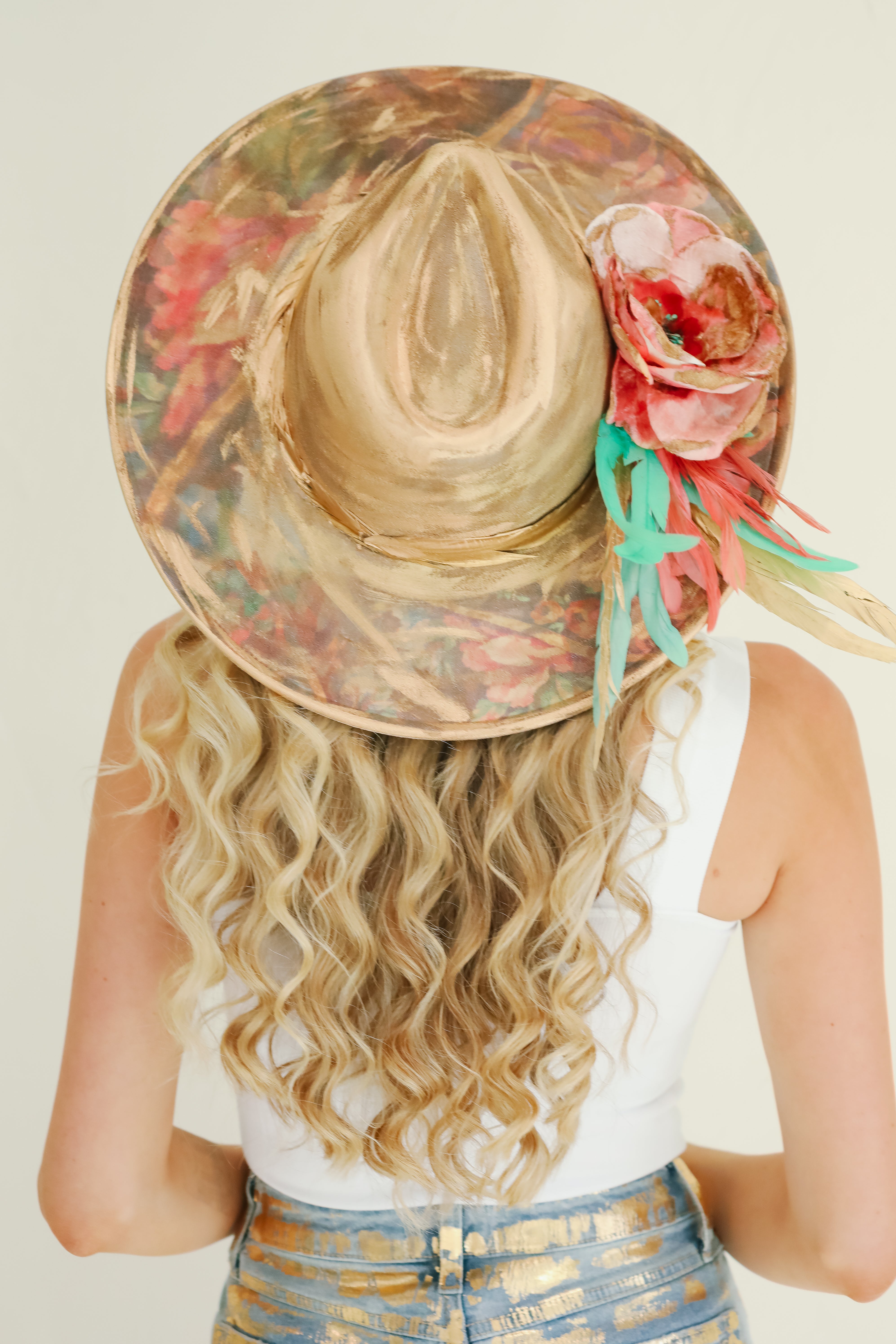 This collection is all about one of a kind and custom hats. Our owner, Stephanie, hand paints and creates each one. They are all unique with touches of dye, vintage pins, vintage feathers and paint.